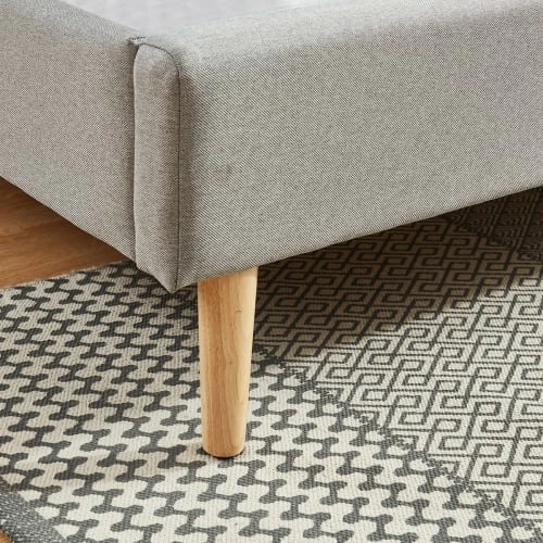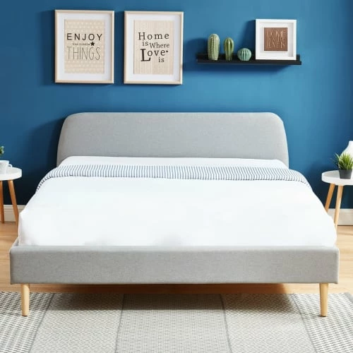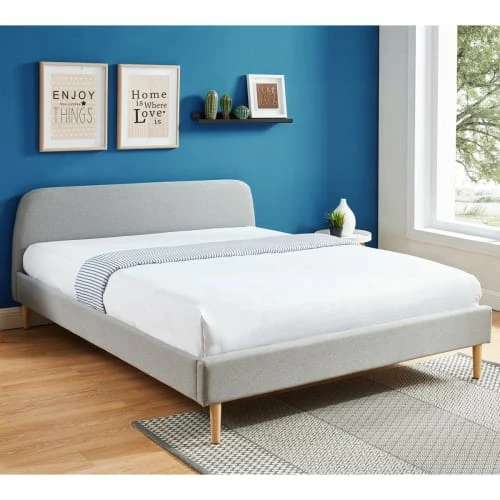 – Style scandinave – Lit adulte – 2 places – Sommier inclus 26 lattes – Tête de lit arrondie – Rembourrage mousse haute densité – Revêtement 100 % tissu – Couleur : gris clair – Structure en bois contreplaqué – Piètement droit – Dimensions : 168 x 213 x 82 cm – Garantie 2 ans – Lattes rangées dans la tête de lit lors de la livraison