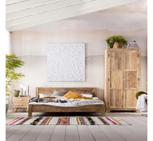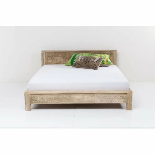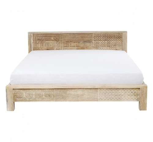 Fidèle à la gamme Puro, ce lit saura vous charmer avec ses motifs ethniques gravés dans le bois de manguier. Ce matériau exotique vous fait voyager dans des contrées lointaines bercées par le soleil et la mer. Agrémenté du tapis ornements beiges vous attendrez avec impatience la fin de votre journée afin de décompresser dans une ambiance relaxante. Livré démonté sans matelas ni sommier. Disponible en : – 160x200cm : 52 kg – 180x200cm : 59 kg Entretien : Dépoussiérez régulièrement le meuble avec un chiffon propre, doux et non pelucheux. Pensez à changer régulièrement de chiffon car des tissus sales peuvent rayer la surface du meuble. Vous pouvez en complément utiliser un vernis transparent pour meuble lorsque le bois commence à perdre son éclat.