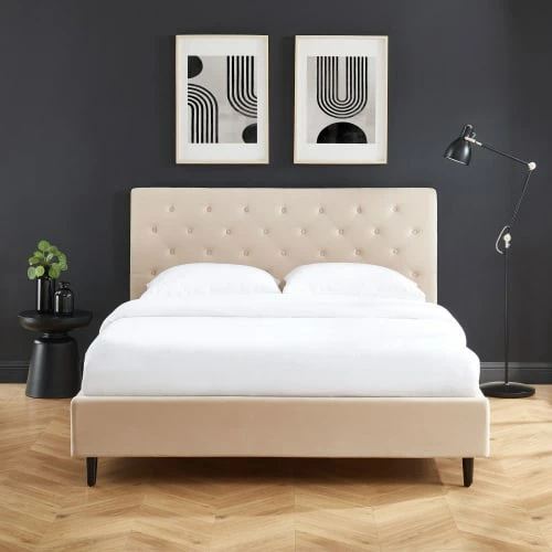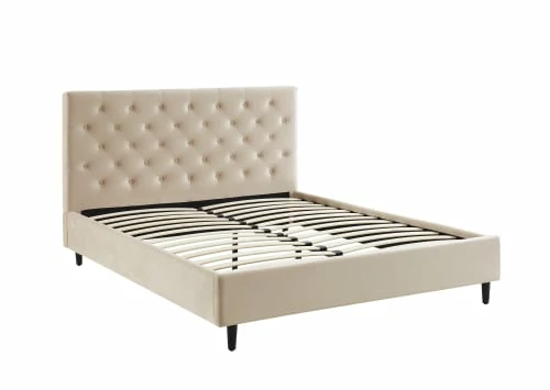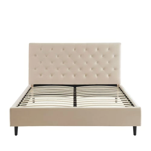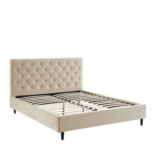 Besoin derafraîchirvotre chambre à coucher? LelitKopitosaura vous combler.Sa tête de lit en velours capitonnée crée une atmosphère chaleureuse, qui nous fait totalement craquer !Avec sesjolis boutons décoratifs,Kopitoa une allure soignée et élégante.Le piétement en bois laqué noir le stabilise à la perfection.Un lit de 160x200cm à la fois grand et robuste qui se marie avec toutes les tendanceset saura harmoniser l’ensemble de la chambre à coucher.À noter que le sommier est inclus, il ne manquera plus qu’un matelas pour combler votre litKopitod’une praticité sans égal.Pour nos lits Kopito avec un revêtement clair, nous vous recommandons de ne pas utiliser de linge de lit de couleur vive ou foncée.