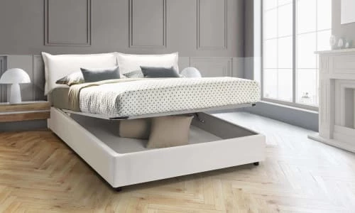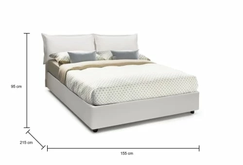 VERONICA FRENCH DOUBLE BED – Lit double français au design moderne Veronica avec tête de lit et conteneur recouverts de cuir écologique rembourré blanc, avec matelas à mémoire de cm 140×200 inclus. STRUCTURE – La structure du lit est en fibre de bois surélevée du sol avec des pieds en ABS et est recouverte en éco-cuir lavable avec un chiffon humide – La tête de lit linéaire assortie en éco-cuir avec surpiqûres apparentes est solide et résistante – Les lattes en bois la base multicouche est incluse dans la structure – Mécanisme d’ouverture en fer – L’ajout de la boîte de rangement pratique et peu encombrante permet de transformer le lit en un coffre spacieux pour les draps, les oreillers et les couettes. MATELAS INCLUS – Matelas orthopédique déhoussable, anatomique, climatisée avec double portance 140×200 hauteur 21 cm – Structure en mousse polyuréthane pleine h 17 cm, densité 30EP recouverte d’une mousse viscoélastique en Memory Foam h 2 cm, densité 55EP losange en partie haute – Housse en tissu stretch de gr 130 , amovible et lavable en machine à 60° – Rembourrage 100% fibre polytechno, hypoallergénique et anti-acarien des deux côtés – Equipé d’une bande tri space respirante avec zip et poignée en tissu. 100% MADE IN ITALY – La production 100% italienne garantit fiabilité et résistance – L’attention portée aux processus de production, le choix de matières premières de qualité et le souci du détail rendent ce lit solide, confortable et résistant dans le temps. MESURES ET OUVERTURE – Dimensions du lit : Longueur 215 x Largeur 155 x Hauteur 95 cm (hauteur nette depuis le sol :.