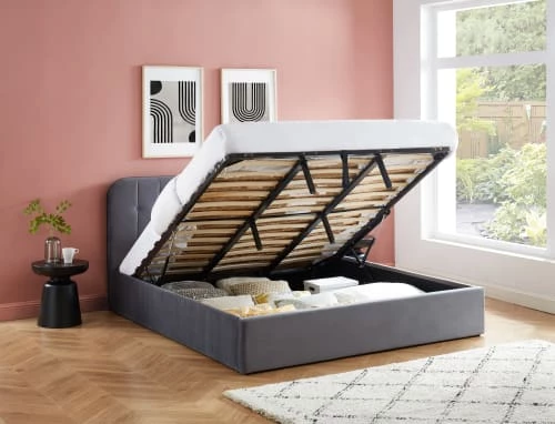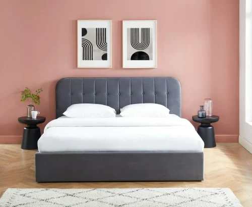 Son atout ? Son coffre qui vous apportera de nombreux espaces de rangement supplémentaires, ainsi que son revêtement en velours gris anthracite lui donnant un style sombre et dans l’air du temps.