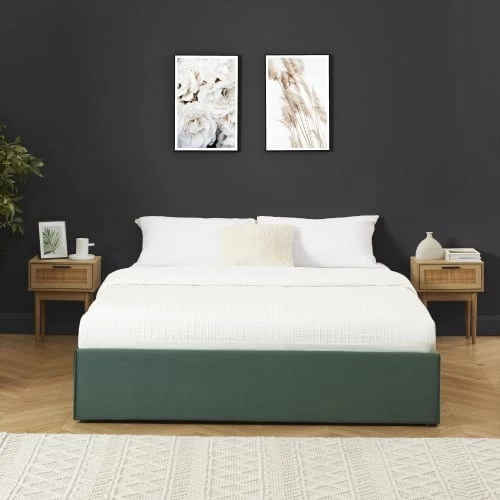 On aime également son revêtement en velours vert forêt, aux tons doux et chaleureux.