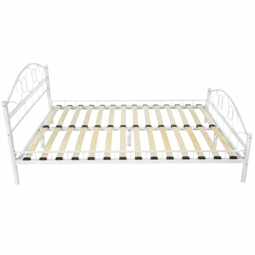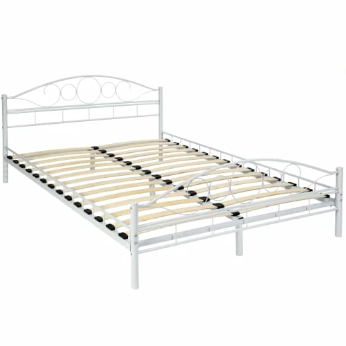 Lit Adulte Métal avec Sommier à Lattes en Bois Design 2 Personnes Hypnos Blanc TECTAKE. Ce magnifique lit en métal vous offre de beaux rêves et un sommeil réparateur. Son design intemporel fait de votre lit un véritable accroche regard, il embellira sans nul doute n’importe quelle chambre à coucher. Le cadre en acier est robuste et stable, il est traité par un revêtement de poudre ce qui lui confère un effet antistatique et résistant aux chocs et aux rayures. Cadre métallique de lit avec sommier à lattes en bois de peuplier souple. Des pieds en plastique protègent le plancher de votre chambre. Dimensions totales du cadre de lit (LxlxH) : environ 203 cm x 147 cm x 90 cm.Dimensions de la surface couchage (Lxl) : environ 200 cm x 140 cm.Hauteur Pieds de lit : environ 60 cm. Hauteur Tête de lit : environ 90 cm. Hauteur du plancher au sommier à lattes : 25 cm. Poids : environ 21,5 kg. Matériau : Cadre en acier peint par poudrage, Pieds en plastique, Bois de peuplier.