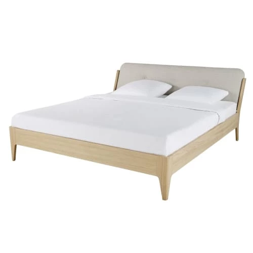 - On aime le mariage du charme et de la douceur entre la structure épurée en placage de chêne et la tête de lit capitonnée beige.