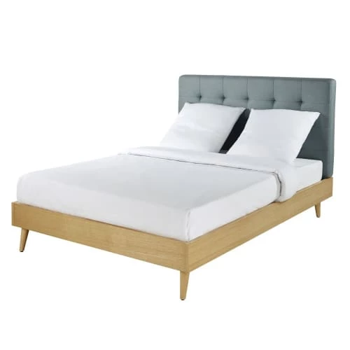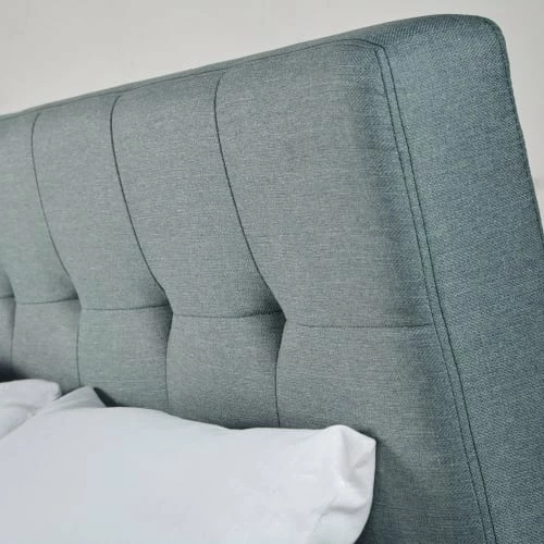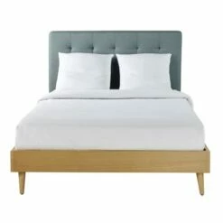Quand le vintage s’associe au scandi, ça donne le lit double capitonné vert et eucalyptus, couchage 160×200 BILLY. Des pieds obliques et robustes, une structure solide conçue en eucalyptus, un bois apprécié pour sa résistance, et un sommier à lattes intégré : on dirait bien que ce lit 2 places multiplie les atouts ! Et parce qu’on voulait vous en mettre plein les yeux, une tête de lit capitonnée verte peaufine son look avec chic, tout en vous offrant du confort.
