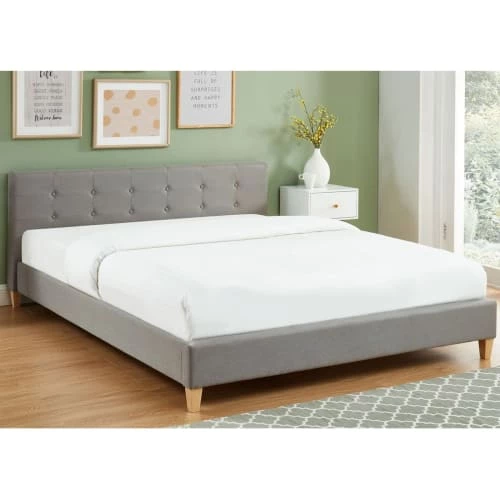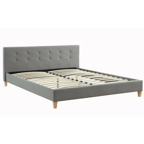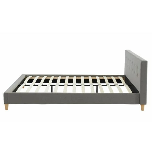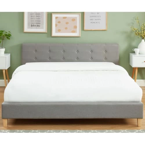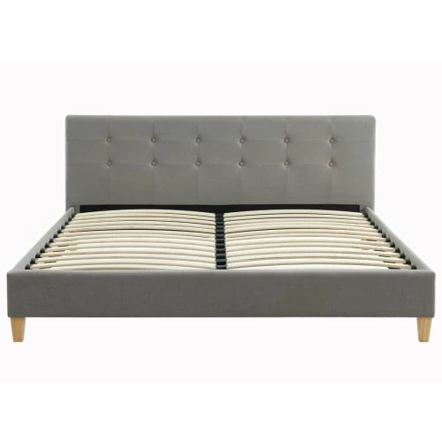 – Style scandinave – Lit adulte – 2 places – Sommier 24 lattes en bois massif de peuplier – Tête de lit rectangulaire capitonnée 172x68x10,5cm – Rembourrage mousse – Revêtement 100 % tissu – Couleur : gris clair – Structure en métal
