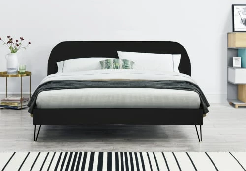 Faites de votre chambre un vrai cocon bien décoré ! Ce lit se mariera parfaitement avec une ambiance rétro-scandinave et ajoutera un certain cachet à votre pièce avec ses finitions velours noir et ses pieds en métal noir !