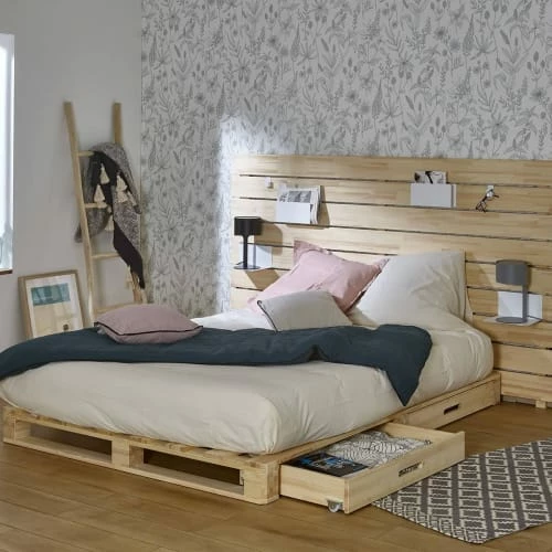 : Créez une ambiance Cosy avec le Pack lit avec tête de lit Cembro. Il séduit par son style unique et affirmé. Le pack lit avec tête de lit Cembro apporte une atmosphère réconfortante grâce son style palette. Fonctionnels, ses tiroirs vous apporteront un espace de rangement supplémentaire. La tête de lit intégréevient enrichir l’esprit chaleureux dans votre chambre à coucher. Solide et robuste, le pack lit avec tête de lit Cembro est fabriqué en Bois Massif afin de vous accompagner dans le temps Caractéristiques : Composition lit :100% Bois Massif certifié FSC*, pin petits nœuds Configuration : tiroir(s) sur roulette inclus, deux tiroirs latéraux pour un lit 140×200 cm Sommier inclus : 8 lattes en bois massif (x2) Éléments de rangements pour tête de lit : métal blanc FabricationEuropéenne Couleur :Bois naturel Dimensions :140*200 Matelas mousse Haute densité de 25 kg/m3 et de 18 cm d’épaisseur inclus À monter soi-même Livraison en rez-de-chaussée du Lundi au Vendredi, de 9H00 à 16H00. Données techniques : Couchage 140×200 cm : Long. 2000 x larg. 1400 x haut. 140 mm Tête de lit :Long. 1980 x larg.40 x haut.1200 mm 4colis – Poids total 62.5 kg
