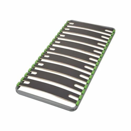 Sommier à lattes Altosenso 90×190 cm.Offre un confort optimal grâce à ses lattes larges. Peut être installé dans un cadre de lit ou directement monté sur pieds.Il est composé de 9 lattes larges multiplis largeur 151 mm, épaisseur 8 mm. Embouts en polypropylène vert. Structure tube métal carré,laqué epoxy coloris gris. Coins arrondis.Poids maximum conseillé : 100kg / place.Dimensions : 88x 188x H4,5 cm.