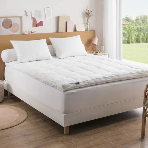 Ce surmatelas a une épaisseur de 10 cm et dispose d’élastiques aux 4 coins pour faciliter sa pose sur le matelas.